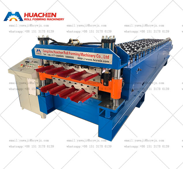 آلة التشكيل المعدنية مزدوجة الطبقة.بما أنه يحتوي على طبقتين،يمكن أن تنتج نوعين من صفائح السقف على آلة واحدة.